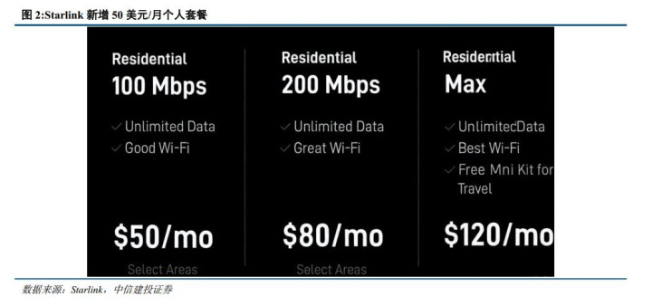 从区域分布来看,2025年北美地区占据了约46%全球市场份额,保持全球最大市场地位。代表企业Starlink拥有全球超900万付费用户和美国本土超300万付费用户,用户数量保持加速增长。1月15日,星链团队宣布在美国全境新增100Mbps的住宅宽带套餐,每月费用仅需50美元,并且原价599美元的信号接收终端设备也改成了免费租用。相比此前最低80美元/月的套餐,Starlink提供了更低门槛的选择,而12.5MB/s和4MB/s的下载上传速度对于普通用户绝大部分场景足够使用。Starlink本次套餐调整意图降低门槛以抢夺美国宽带运营商的用户。随着未来Starlink组网卫星数量进一步提升,以及年内计划发射的新一代Starlink V3卫星(容量约为V2卫星的20倍),千兆级别卫星互联网服务有望落地,同时带来整体成本和用户套餐费用下降,更利于用户渗透率提升。