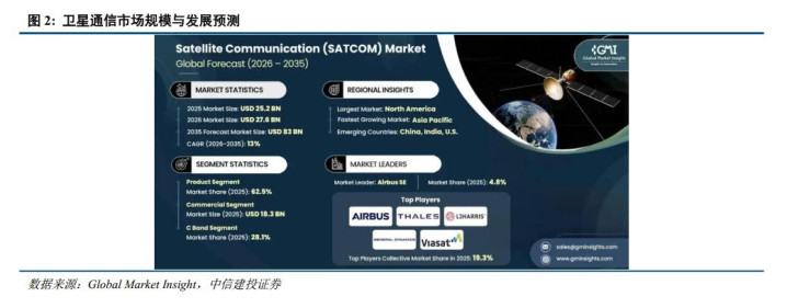 卫星通信市场稳健增长,2035年规模有望接近千亿美元。根据Global Market Insight数据,2025年全球卫星通信市场规模约为252亿美元,预计2035年市场规模将增长至830亿美元,未来十年CAGR约13%。卫星互联网连接需求扩张、小型化卫星星座发展、偏远地区连接需求增加、IoT与M2M连接需求提升以及卫星与5G网络整合需求提升共同贡献了未来卫星通信市场的稳健增长。
